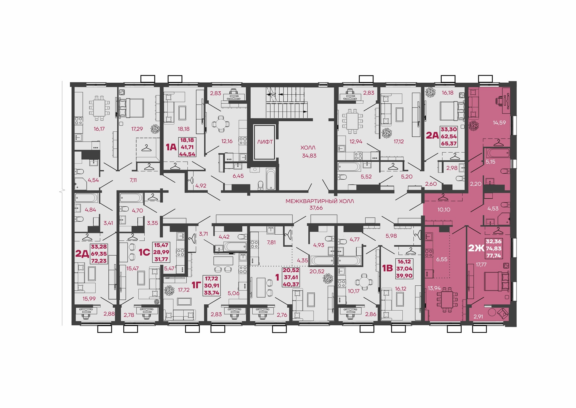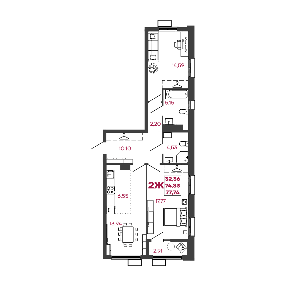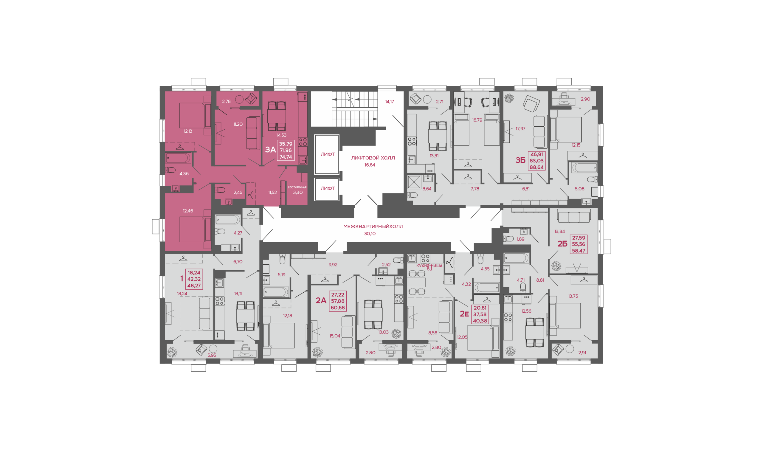 В ЖК Дебют представлены 15 типов планировок, начиная от классических вариантов и заканчивая евроформатами, площадью от 31 м² м до 86 м². Уникальные для Кузнецка варианты квартир: мастер-спальни и постирочные, теплые лоджии с радиаторами, выделенные места под гардеробные, окна в ванных комнатах.