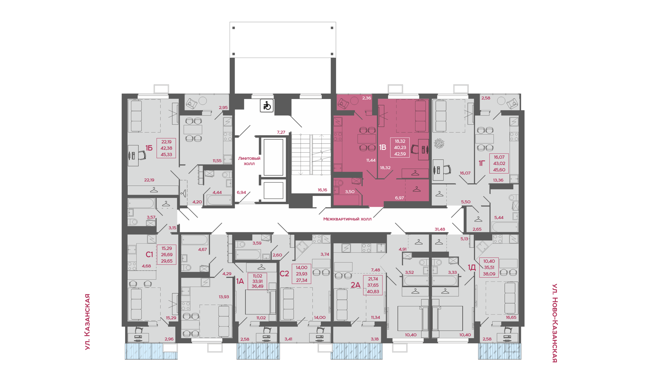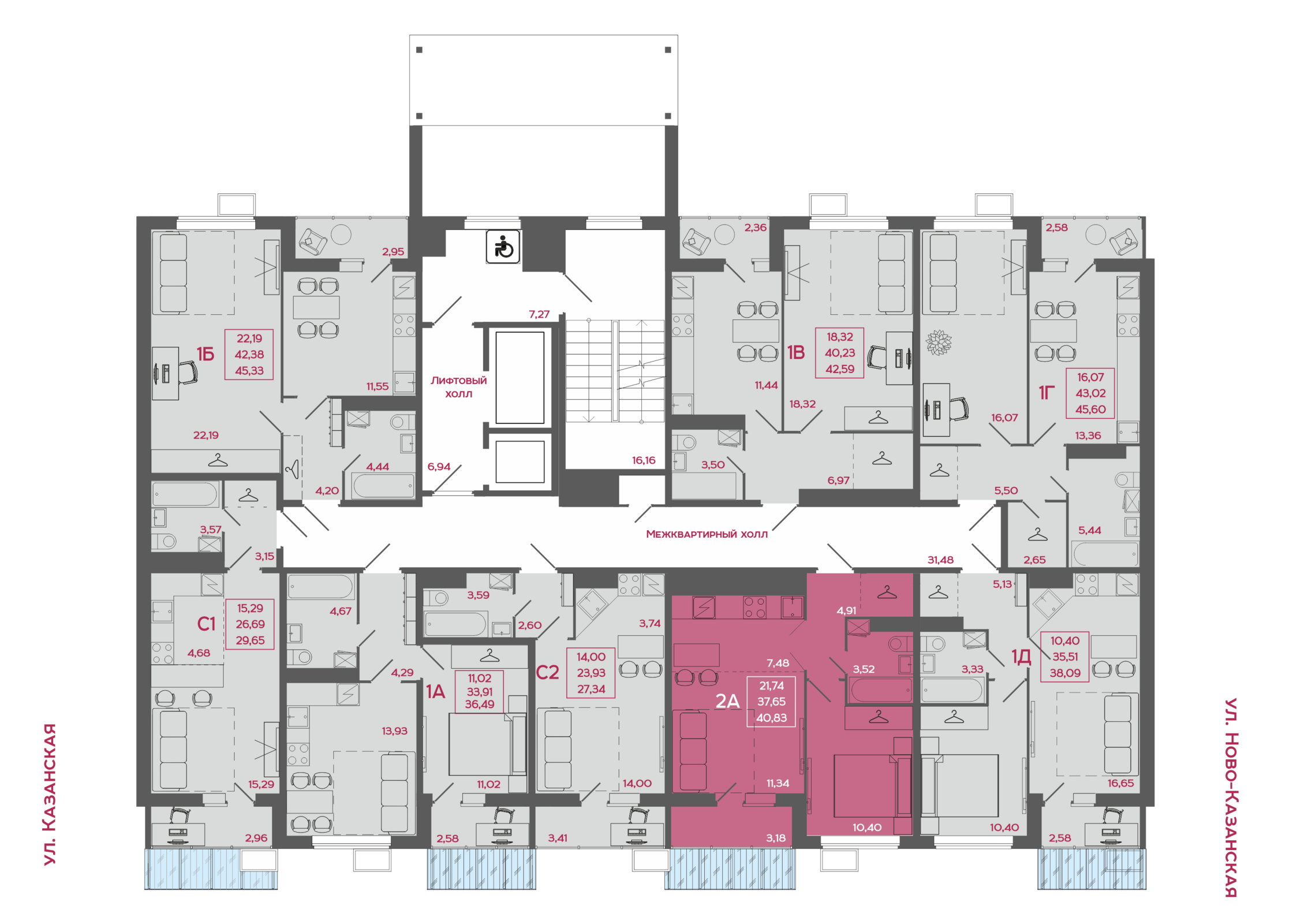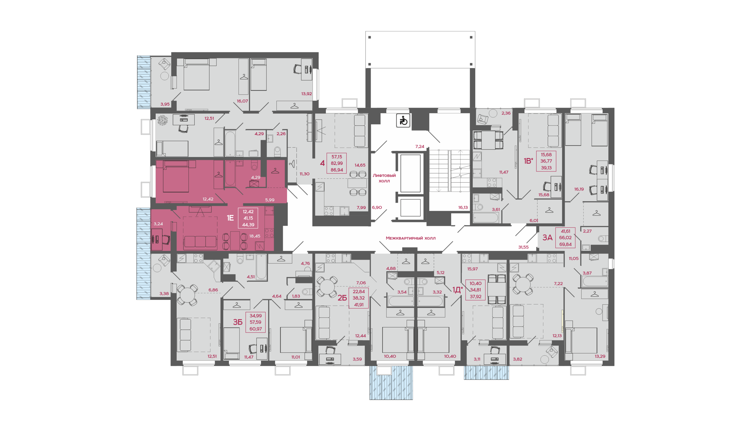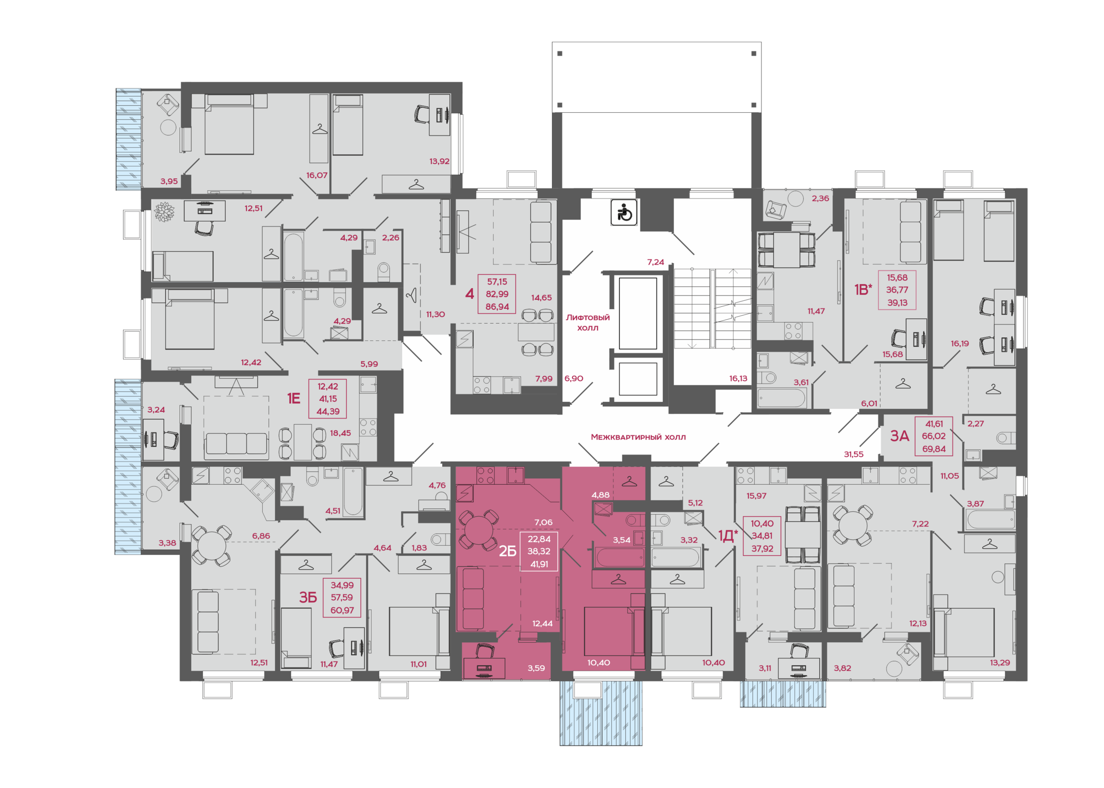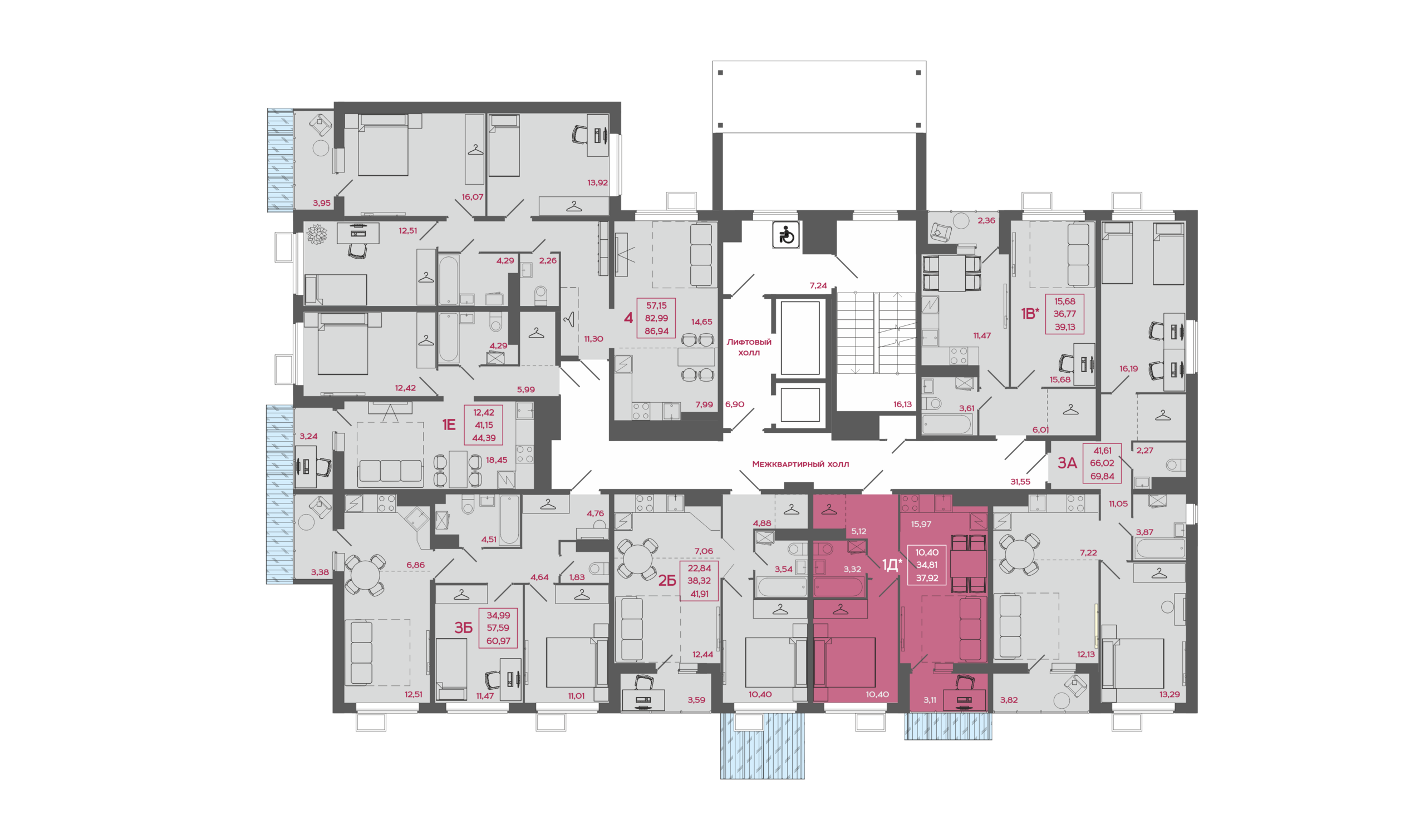 - квартиры площадью от 27,34 м² до 86,94 м²