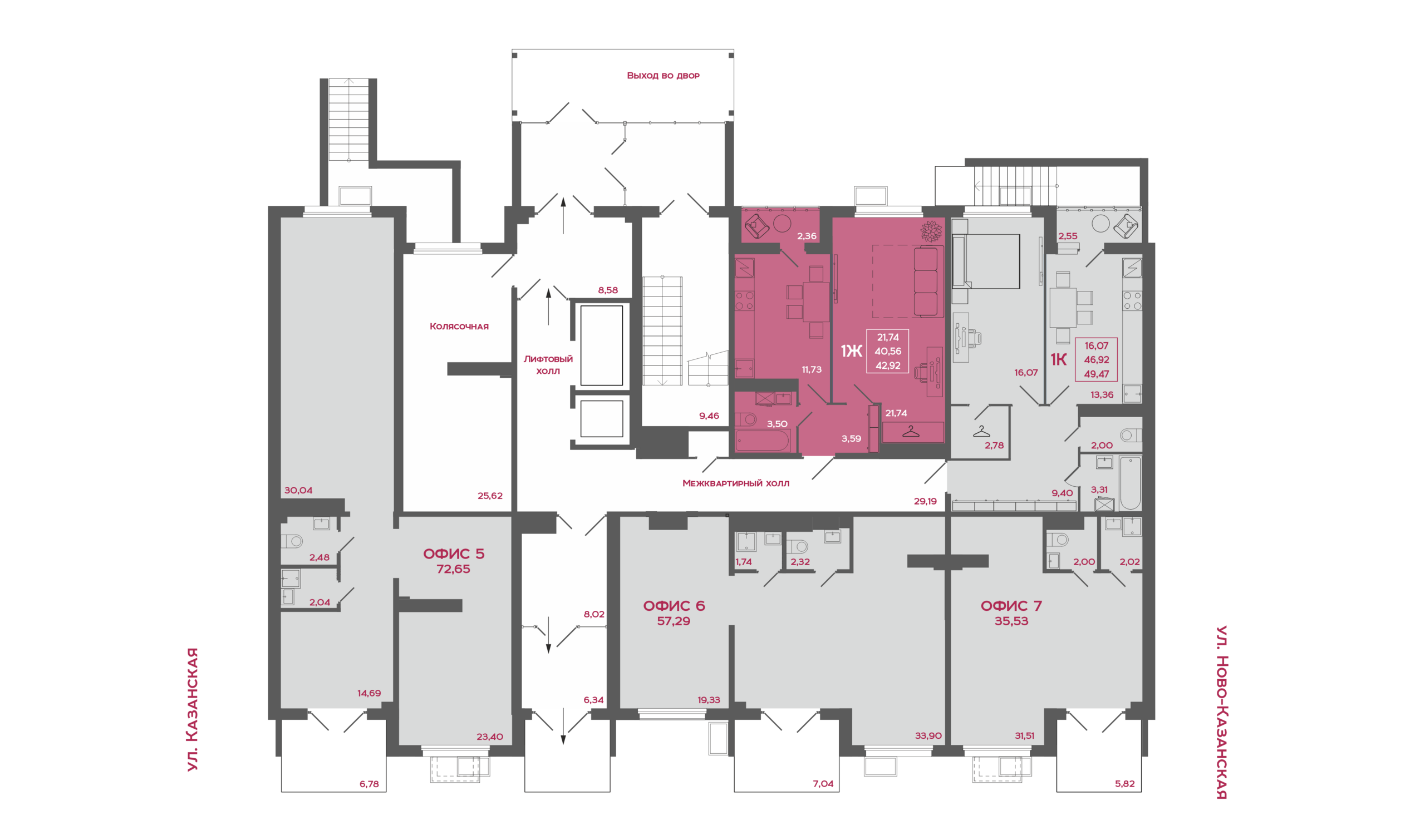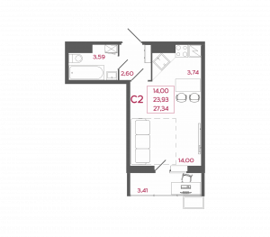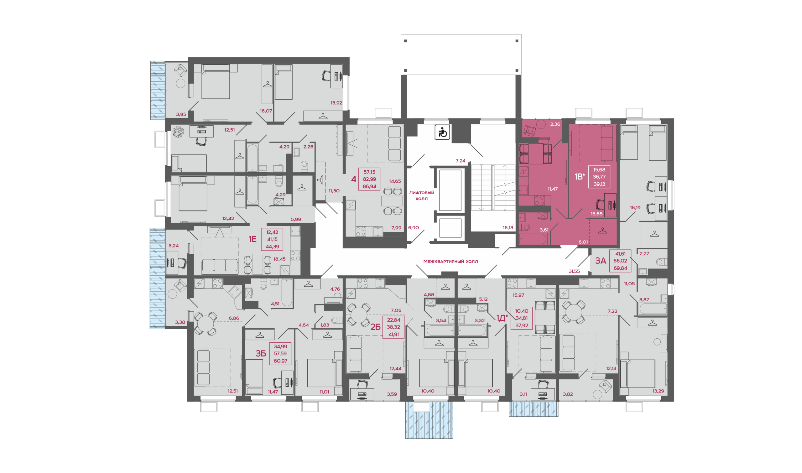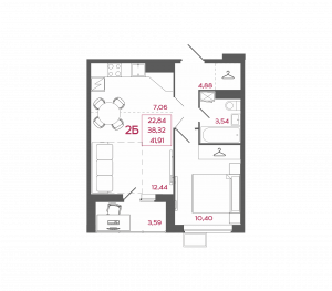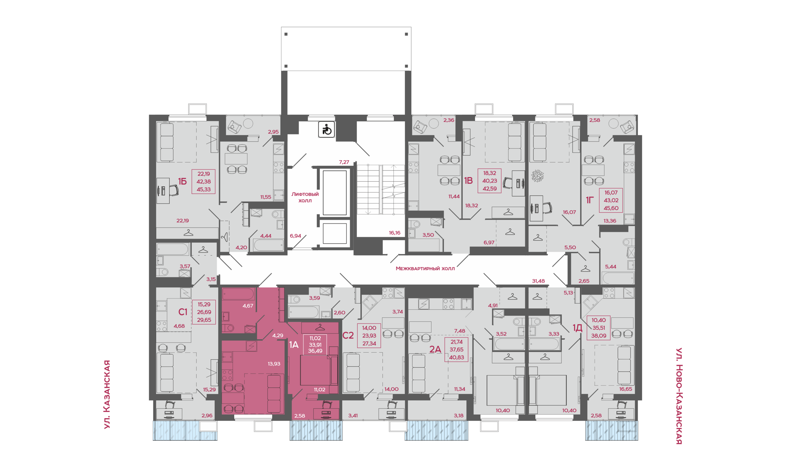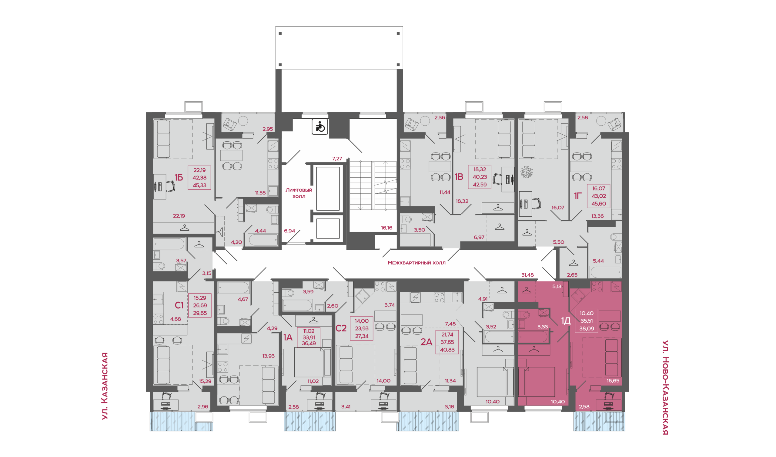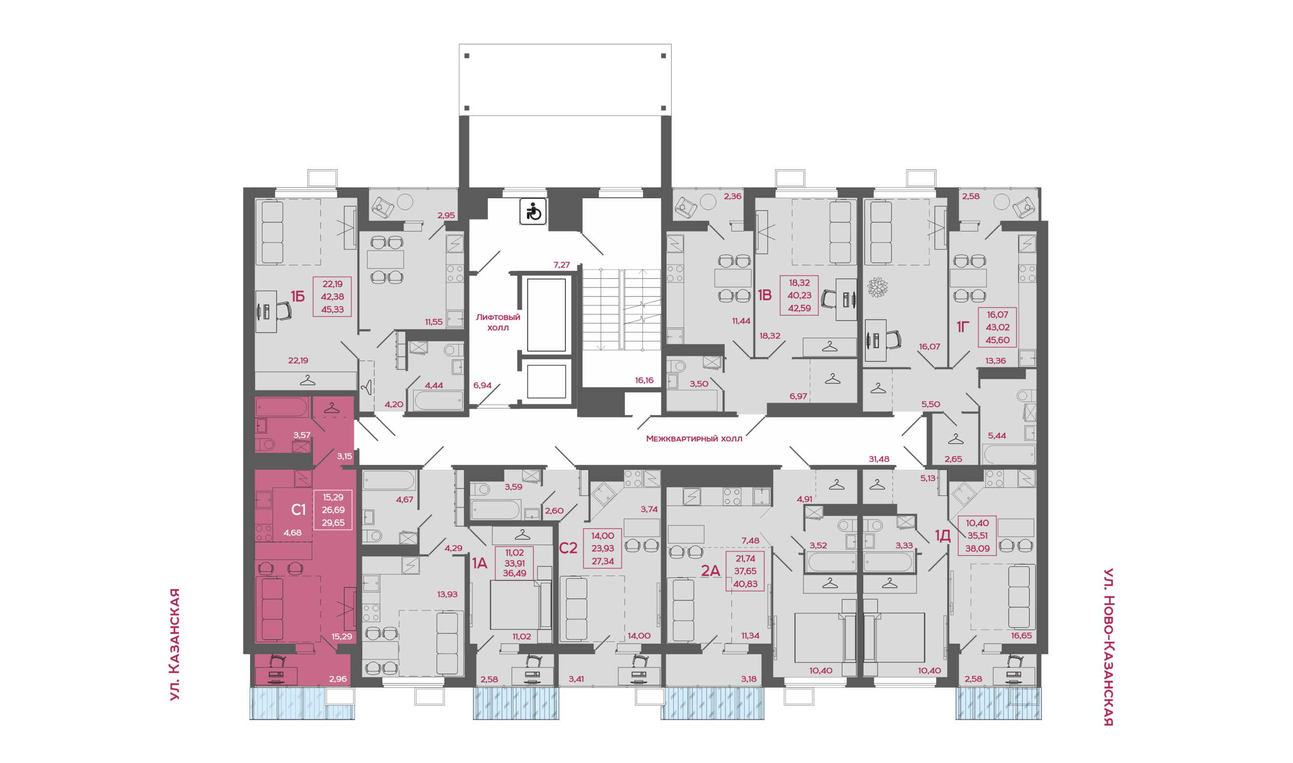 - квартиры площадью от 27,34 м² до 86,94 м²