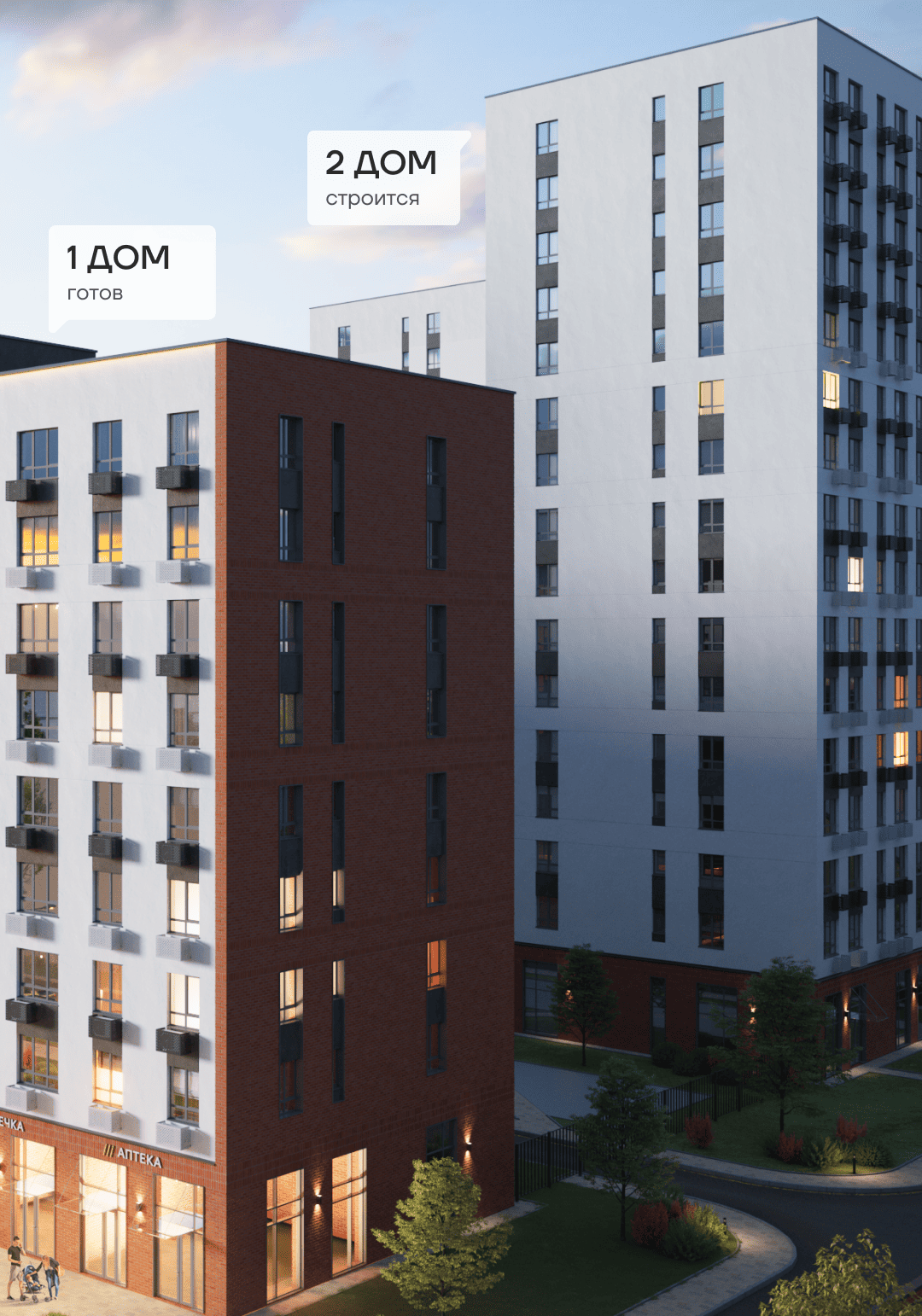 1 дом стал началом комплексной застройки уникального жилого квартала в сердце города и сегодня вы уже можете видеть возведенный фасад и активные работы по остеклению и отделке.